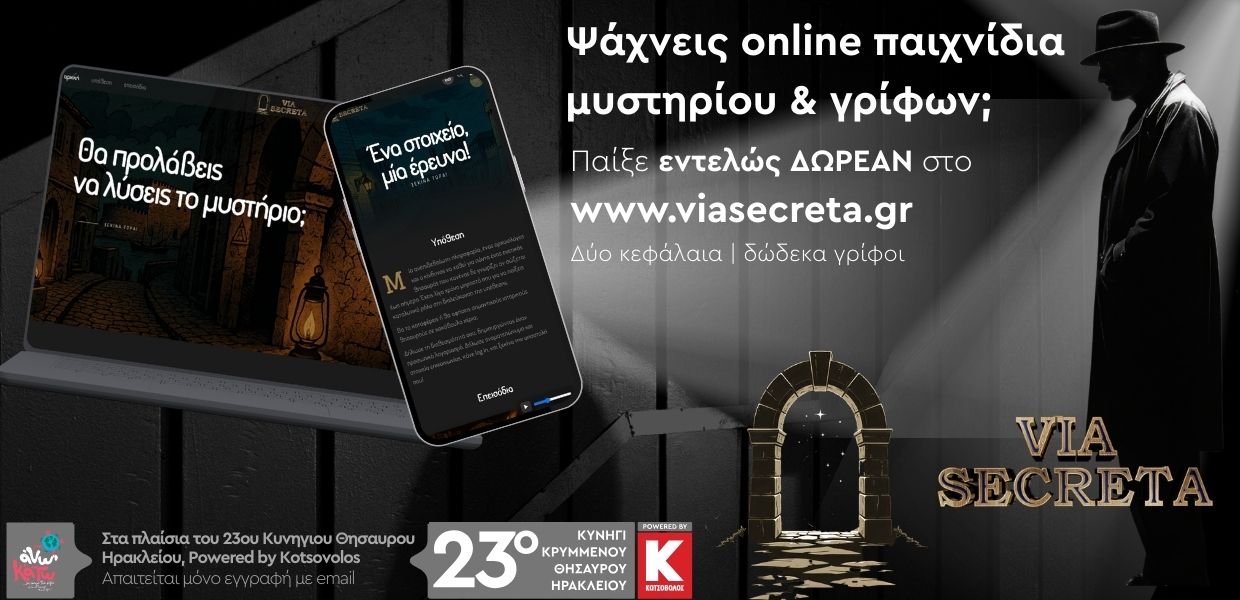Η επίσημη σελίδα του 23ου Κυνηγιού Κρυμμένου Θησαυρού powered by Kotsovolos θα είναι διαθέσιμη σε μερικές ημέρες. Αν ανυπομονείς, μπορείς να παρακολουθείς τα νέα μας στα social media της ομάδας, ή να παίξεις το διαδικτυακό παιχνίδι γρίφων που ετοιμάσαμε viasecreta.gr!